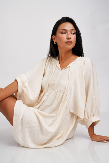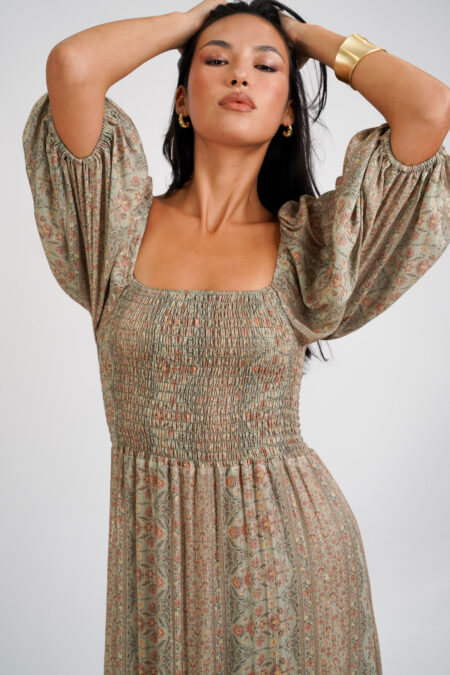 - Vestido largo con pecho de nido de abeja y mangas abultadas